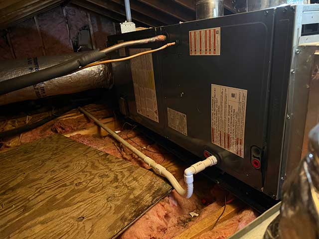This project presented some unique challenges. First, the home had blown-in insulation, which required extra care to ensure no dust or debris entered the living space during the installation. To top it off, it was a rainy day, making the outdoor work a bit more difficult. The biggest hurdle, however, was the limited access to the installation site. With no traditional access points available, our skilled technicians had to get creative and carefully maneuver the new air handler and condenser through the return grill. Talk about a tight squeeze!
